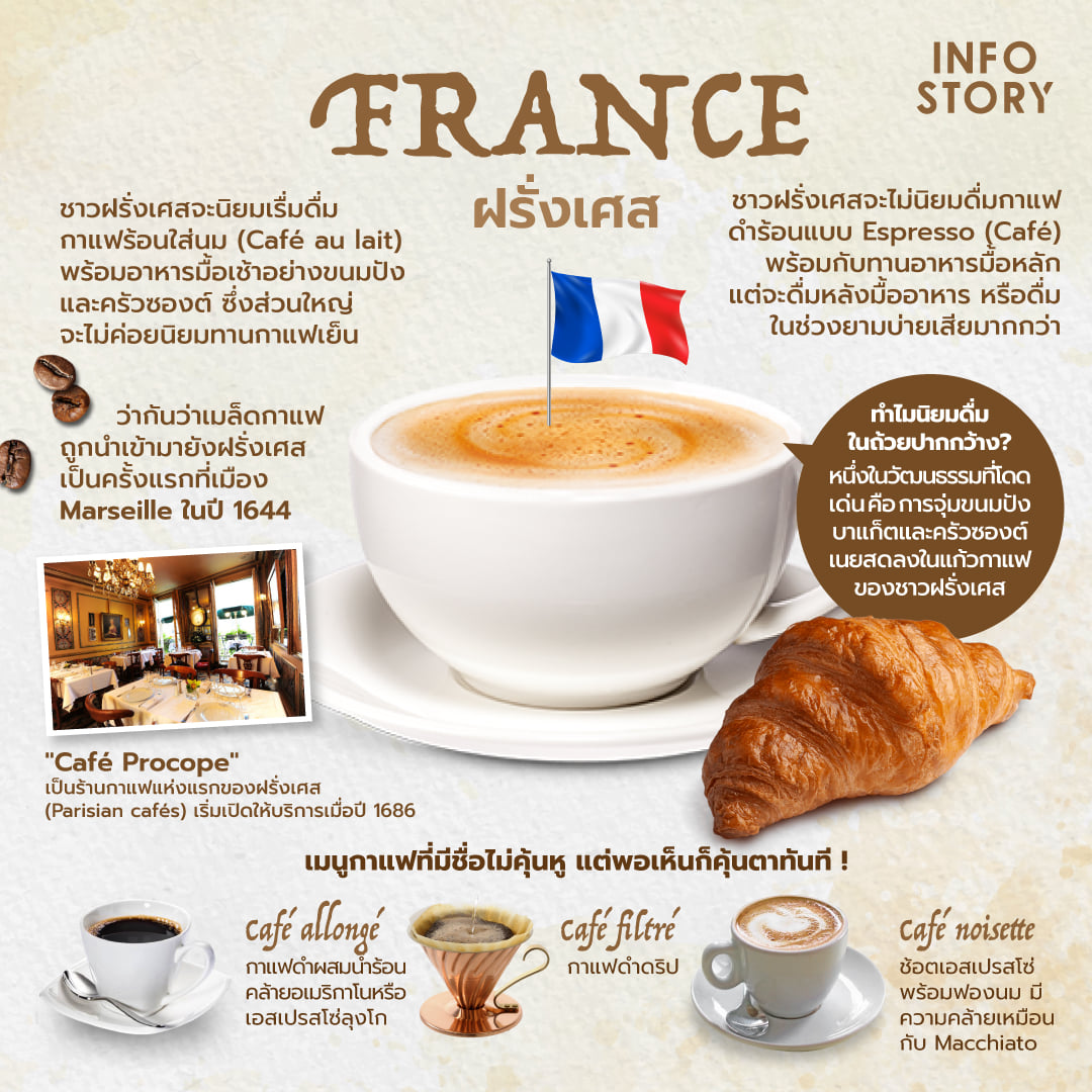 (ซึ่งเราอาจพอสังเกตเห็นความคล้ายคลึงกันในเรื่องวัฒนธรรมการดื่มกาแฟของชาวฝรั่งเศสและชาวอิตาลี เช่น เมนูกาแฟนม หรือ การดื่มกาแฟนมสำหรับมื้อเช้า แต่ก็อาจจะยกเว้นในเรื่องของนั่งและยืนดื่มกาแฟ ที่อาจแตกต่างกันเนอะ)