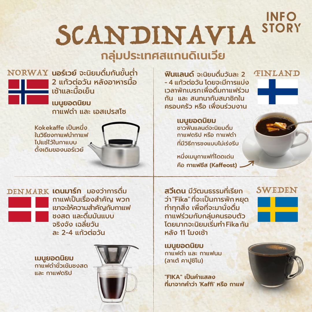 จริง ๆ ต้องขอบอกว่าแต่ละประเทศในกลุ่มสแกนดิเนเวียต่างมีวัฒนธรรมในการทานกาแฟที่โดดเด่น มากกว่าข้อมูลในภาพที่เราได้เลือกมานำเสนอเสียอีกนะ