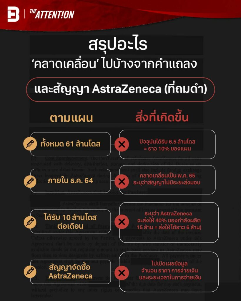 เป็นประเด็นที่สังคมให้ความสนใจอย่างมากเมื่อวันที่ 15 ก.ค. สาธิต ปิตุเตชะ รัฐมนตรีช่วยว่าการกระทรวงสาธารณสุข ให้สัมภาษณ์ว่ามีการ ‘คลาดเคลื่อน’ เรื่องสัญญาการจัดซื้อวัคซีน AstraZeneca จากที่จะมีการจัดส่งภายในเดือน ธ.ค. 2564 ตามที่รัฐบาลระบุไว้ในตอนแรก แต่อาจเป็นช่วงเดือน พ.ค. 2565 เนื่องจากในสัญญาอาจไม่ได้มีการระบุชัดเจนว่าจะต้องจัดส่งทั้งหมดเมื่อไร ระบุเพียงแค่จำนวน 61 ล้านโดสตามแผนเท่านั้น