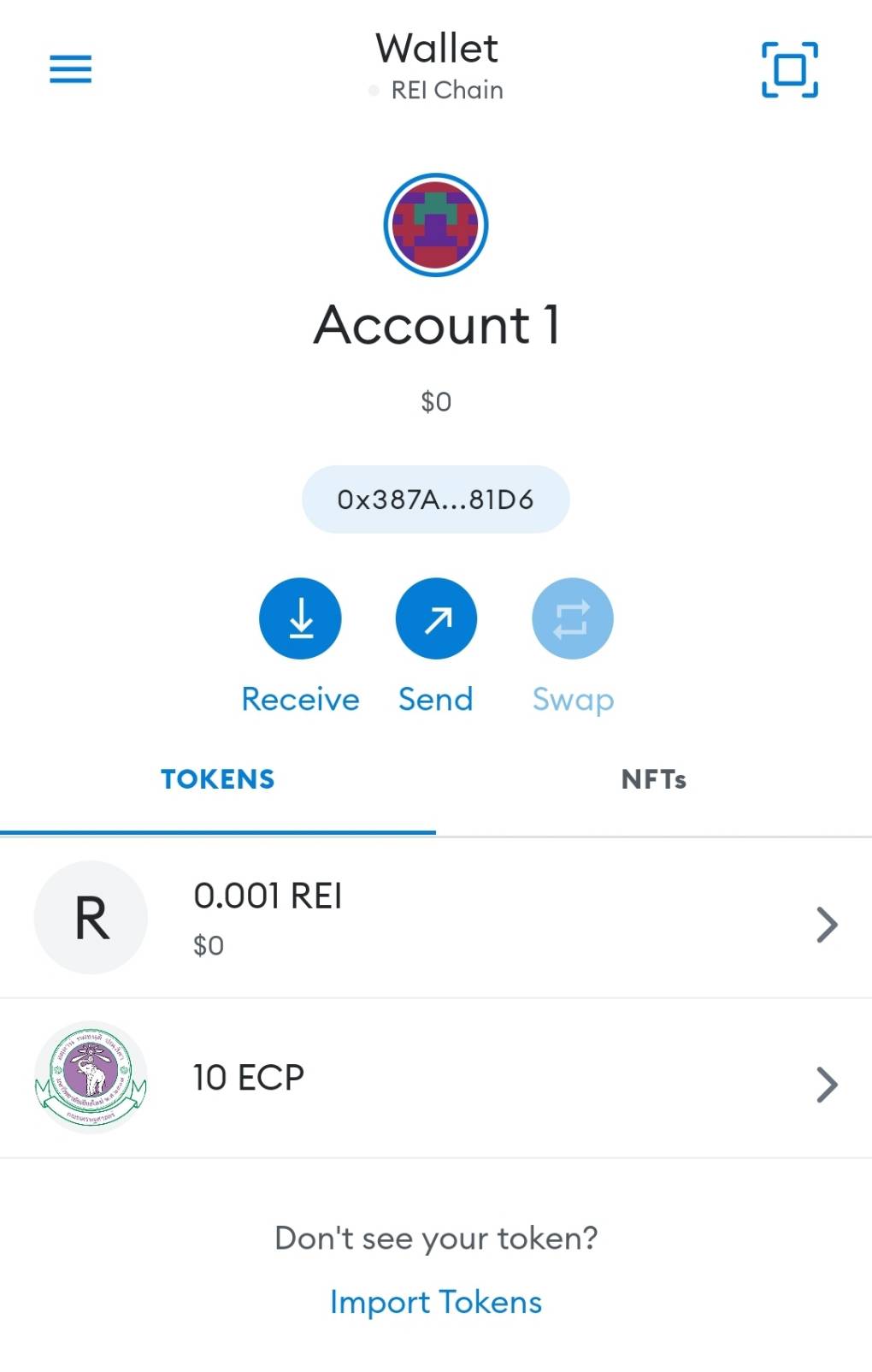 ซึ่งหลังจากการสแกน QR Code ก็จะมีขึ้นหน้า ให้ เปลี่ยน Network จาก Ethereum มาเป็น REI chain และจะมีให้ Add เหรียญ ECP หรือ Econ Point เข้ามาใน Wallet เรา แล้วเมื่อเรากลับมาเข้าหน้า Wallet เรา ก็จะขึ้นด้านบนว่า เราเชื่อมต่อกับ REI Chain และมีชื่อเหรียญ REI ซึ่งเป็นเหรียญหลัก ประจำบล็อคเชน เอาไว้จ่ายค่าธรรมเนียม หรือที่เรียกว่าค่า Gas และเหรียญของคลาส ECP