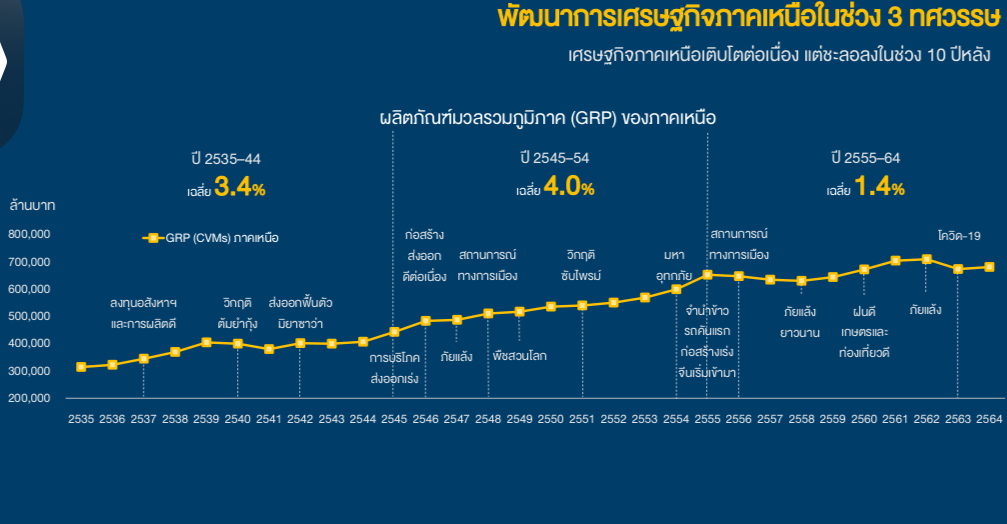 และสุดท้ายของหัวข้อนี้พูดถึงภาคการเกษตร ภาคการท่องเที่ยว และภาคอุตสาหกรรม ในพาร์ทนี้ได้ยก เศรษฐกิจของภาคเหนือมาพูด ว่าตั้งแต่ปี 2535 ถึง ปีปัจจุบันมีอัตราการที่เพิ่มมากขึ้นหรือไม่ จากที่กราฟแสดง ปี 2535-2544 เฉลี่ย 3.4% ปี 2545-2554 เฉลี่ย 4.0% และปี 2555-2564 เฉลี่ย 1.4% เนื่่องด้วยมรสถาการณ์โดวิดและสถานการณ์ทางการเมือง