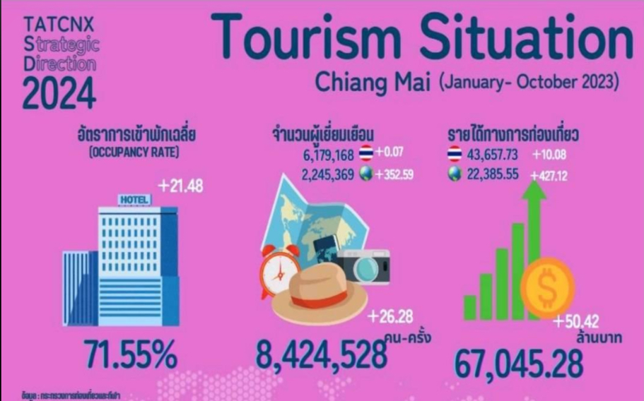 การใช้จ่ายเพื่อการบริโภค พูดถึงภาคการท่องเที่ยว ในจังหวัดเชียงใหม่ ว่าในปี 2023 ตั้งแต่เดือนมกราคมถึงตุลาคม ว่ามีอัตราการเข้ามาของนักท่องเที่ยวเท่าไหร่ โดยมีรายได้จาการที่นักท่องเที่ยวเข้ามาประมาณ 67,045.28 จะแสดงในรูปด่านล่าง