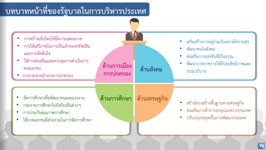 เป็นเรื่องเกี่ยวกับหน้าที่ของรัฐบาลในการมีบทบาทหน้าที่กับประชาชน รัฐบาลควรมีการปรับโครงสร้างพื้นฐานให้ประชาชนมีการเป็นอยู่ที่ดี รับฟังปัญหาและข้อบกพร่องของประชาชนในแต่ละพื้นที่ บางพื้นที่ยังไม่สามารถเข้าถึงความเจริญ เพราะฉะนั้นการรับฟังปัญหาที่ประชาชนเจอ รัฐควรให้ความสำคัญและพร้อมลงมือปฏิบัติอย่างทันท่วงที เพื่อให้ประชาชนที่เป็นกองกำลังของชาติได้มีการขับเคลื่อนเศรษฐกิจออกไปในทางที่ดีขึ้นมากกว่าเดิม ขอยกตัวอย่างหน้าที่รัฐจากรูปด้านล่างมา 1 หัวข้อ คือ ด้านเศรษฐกิจ ไทยมีการทำการค้าระหว่างประเทศหลายแห่ง ดังนั้นรัฐต้องทำการประเมินด้านนี้ว่า จะสามารถทำกำไรรายได้ให้ไทยได้มากเพียงใด และหาสิ่งที่เป็นสินค้าหลักในการส่งออก เพื่อจะได้ปรับโครงสร้างและพื้นที่ที่ได้ผลิตสินค้าตัวนี้ ขอยกตัวอย่างเป็น ยางพารา ในภาคใต้ของไทยมีการทำยางพาราเยอะกว่าภาคอื่นๆ เพราะฉะนั้นควรมีมาตรการในการช่วยเหลือเกษตรกรที่ทำการปลูกยาง เพื่อให้มีการส่งออกที่มากขึ้น และการนำเข้าน้อยลงเพื่อรักษาสมดุลทางการเงินภายในประเทศ