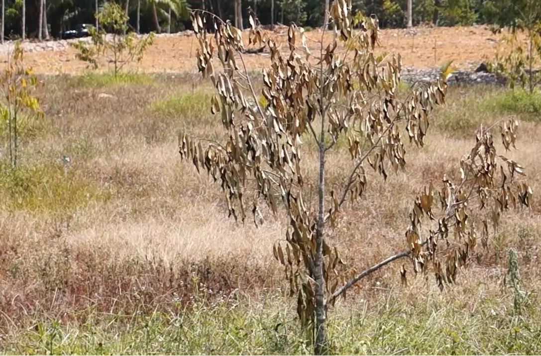 ตัวอย่างภัยแห้งแล้งจัด คลองน้ำแห้งขอด ฝนทิ้งช่วงมานานกว่า 2 เดือน ได้เริ่มต้นขึ้นแล้วในปีนี้ของประเทศไทย ที่ จ.ชุมพร เมื่อเดือนก่อนๆ ทำให้ต้นทุเรียนเล็กยืนต้นตาย รวมถึงกระทบถึงพืชสวนอื่นๆ อีกด้วย (ขอบคุณภาพจากรายงานข่าวไทยรัฐออนไลน์)