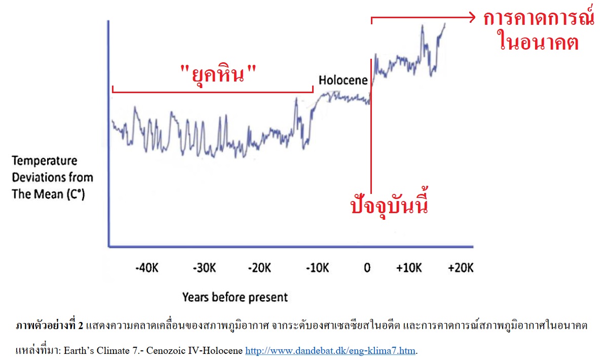 ภาพตัดจากบทความวิจัยที่แสดถึงความผันผวนของอุณภูมิโลกในยุคหินลงมา เมื่อประมาณกว่า 40,000 ปีก่อนปัจจุบัน มาจนถึงยุคโฮโลซีนที่เริ่มมีสภาพอากาศคงที่ยาวนานเป็นพิเศษจากเมื่อประมาณ 12,000 ปีที่แล้วมาจนถึงปัจจุบันนี้ และแสดงถึงการคาดการณ์ความผันผวนอย่างสุดขั้วของสภาพอากาศหลังจากปีปัจจุบันเป็นต้นไปที่จะเริ่มเปลี่ยนผันขึ้นลงๆ สลับขั้วกันเหมือนในช่วงยุดหินขึ้นอีกครั้งแล้ว ซึ่งนั่นจะยากลำบากต่อการทำเกษตรขนานใหญ่ไปทั่วโลก!