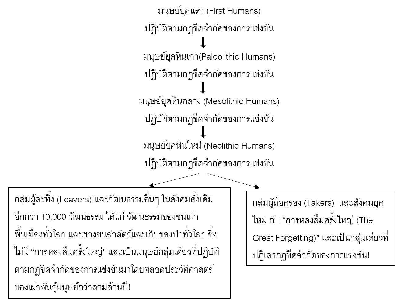 “และในช่วงเวลาทั้งหมดนี้เอง ก็ก่อให้เกิดการหลงลืมครั้งใหญ่ขึ้นว่า มันเคยมีช่วงเวลาหนึ่ง และมันเป็นช่วงเวลาอันแสนยาวนาน ที่วิถีชีวิตของเผ่าพันธุ์มนุษย์เราต่างก็ดำรงอยู่มาด้วยการล่าสัตว์และเก็บของป่า หรือ (Hunting and Gathering) มากกว่า การดำรงอยู่มาด้วยการเลี้ยงสัตว์ และการทำเกษตรกรรม” ซึ่งมันเป็นช่วงเวลาที่ไม่มีใครสักคนเดียวที่ดำเนินชีวิตด้วยการทำอาชีพเครื่องปั้นดินเผา หรืออาชีพจักสานตะกร้า หรือทำอาชีพเป็นช่างตีเหล็ก มันเป็นช่วงเวลาที่เรื่องการค้าขายสินค้ากลับเป็นเรื่องที่คาดไม่ถึงเลยว่า “มันจะกลายมาเป็นความหมายของการดำรงชีวิตของมนุษย์ในยุคนี้” พวกเราก็แทบจะไม่ตกใจอะไรเลยกับการหลงลืมเช่นนี้! มันจึงเข้ามาแทนที่จุดยืนของมวลมนุษย์เรา มาตลอดประวัติศาสตร์ที่เหลืออยู่ทั้งหมดกว่า 300,000 ปี ของมนุษย์สายพันธุ์โฮโมเซเปียนส์