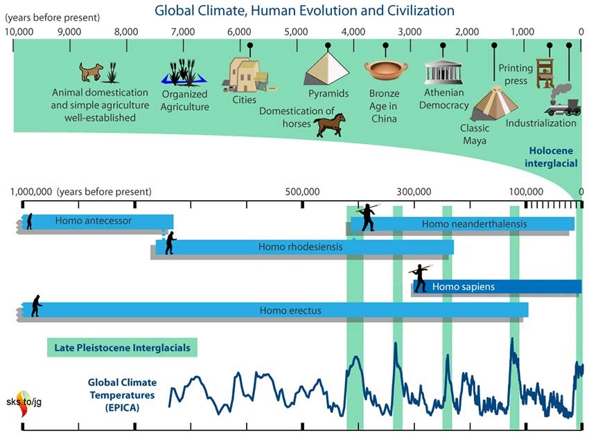 คำอธิบายภาพเริ่มจากด้านล่างสุด ดังนี้: เส้นกราฟด้านล่างสุดชี้ให้เห็นว่า สภาพอากาศของโลกมีความผันผวนขึ้นลงอย่างต่อเนื่องนับมาตั้งแต่ช่วงเวลาประมาณ 800,000 ปีก่อน (ดูเทียบกับเส้นบอกห้วงเวลาทั้งหมดจาก 1,000,000 ปีก่อน ตรงกลางในภาพ ที่แสดงถึงการปรากฎตัวขึ้นของมนุษย์สายพันธุ์ต่างๆ อีกด้วย) ความน่าสนใจของภาพนี้ก็คือการชี้ให้เห็นถึงว่า “ในช่วงเวลากว่า 12,000 -10,000 ลงมานี้เองที่จัดอยู่ในยุคโฮโลซีนทั้งหมดที่มีสภาพอากาศคงที่ยาวนานเป็นพิเศษ จึงส่งผลให้มนุษย์ในยุคนี้สามารถทำเกษตร ตั้งถิ่นฐานถาวร ก่อตั้งอารยธรรม และขยายฐานเศรษฐกิจและอุตสาหกรรมได้เรื่อยมาจนถึง ณ ปัจจุบันนี้” โดยแสดงถึงหลักฐานนับตั้งแต่การเริ่มหันมาทำการเพาะปลูกอาหารในพื้นที่เล็กๆ เริ่มมีการเลี้ยงสัตว์ร่วมด้วย จากนั้นก็เริ่มมีการทำเกษตรอย่างมีแบแผนยิ่งขึ้น จากนั้นก็มีการตั้งเมืองต่างๆ และก่อตั้งอารยธรรมโบราณในยุคสมัยต่างๆ ขึ้น เรื่อยมาจนถึงยุคอุตสาหกรรมในปัจจุบัน ผ่านแต่ละช่วงเวลาโดยประมาณที่อิงตามหลักฐานทางประวัติศาสตร์ (ดูเทียบกับห้วงเวลาด้านบนสุดในภาพ)