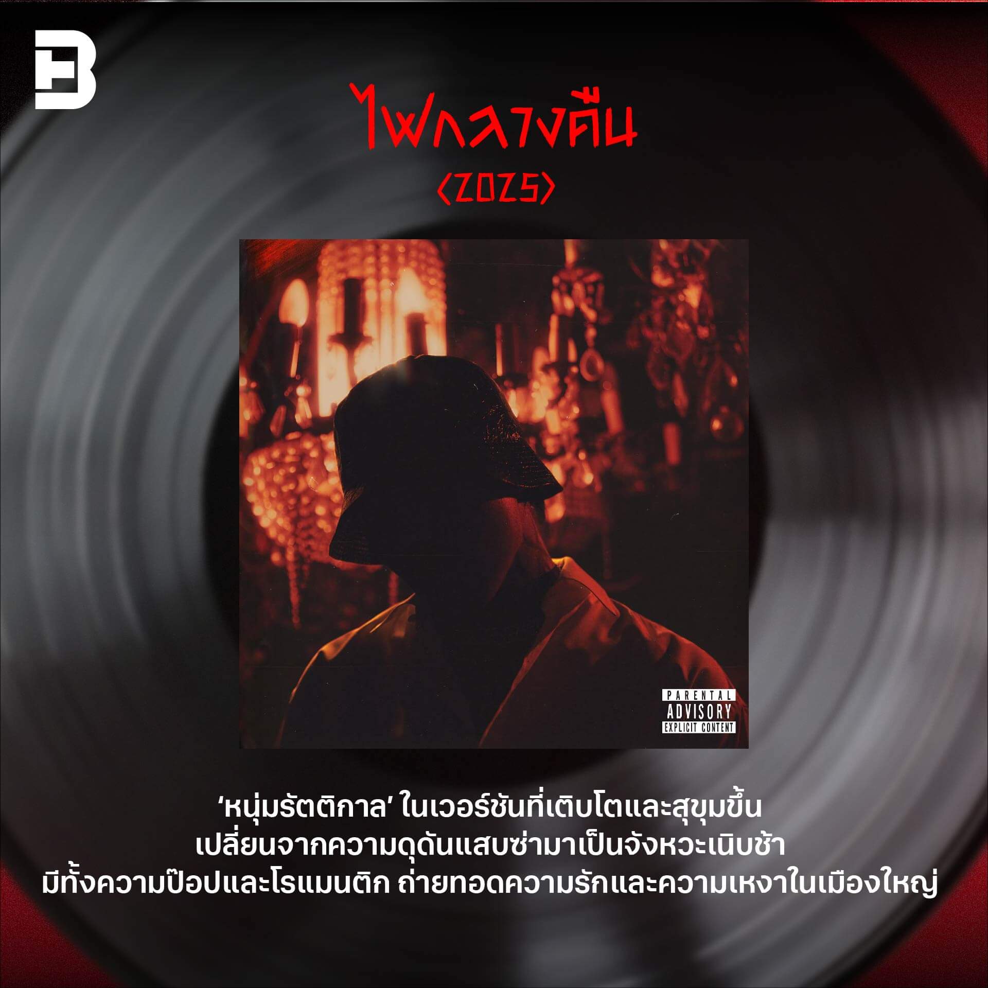 การมาถึงของคอนเซ็ปต์อัลบั้มชุดล่าสุดอย่าง ‘ไฟกลางคืน’ เป็นการตอกย้ำคาแรกเตอร์ ‘หนุ่มรัตติกาล’ ได้อย่างชัดเจน โทนดนตรีตลอดครึ่งแรกของอัลบั้มเน้นความเนิบช้า สงบ และมีความป๊อปมากขึ้นอย่างเห็นได้ชัด กว่าจะเข้าสู่จังหวะแรปจัดจ้านหรือซาวด์แทรปคุ้นหู ก็ล่วงเข้าเกือบกลางอัลบั้ม นั่นเป็นเพราะคอนเซ็ปต์ ‘ชีวิตกลางคืน’ ถูกตีความผ่านอารมณ์ที่นิ่ง ละเอียด และเป็นส่วนตัวกว่าที่เคย